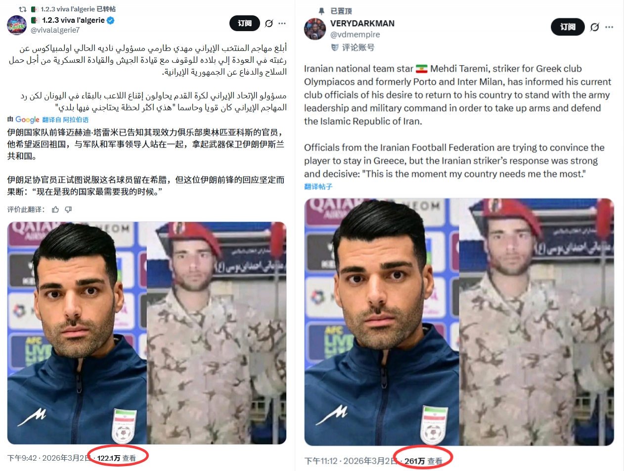 综合多方信源交叉核实,基本可以判断“塔雷米回国参战”的所谓爆料,实际源于海外社交平台营销号的起号套路。在层层转载过程中,因缺乏严格的事实核查,最终演变为一场围绕虚假信息展开的流量狂欢。